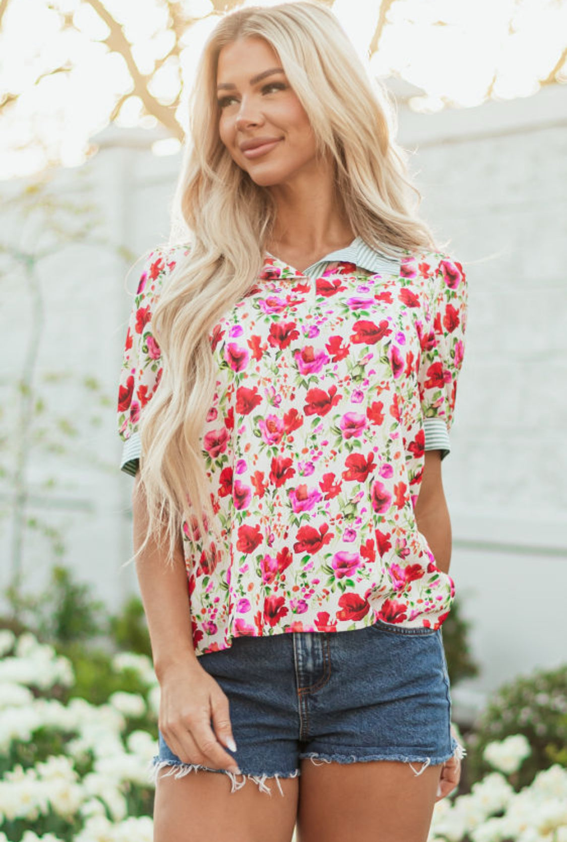 - Delight in the charming fusion of floral prints and stripes on this blouse.